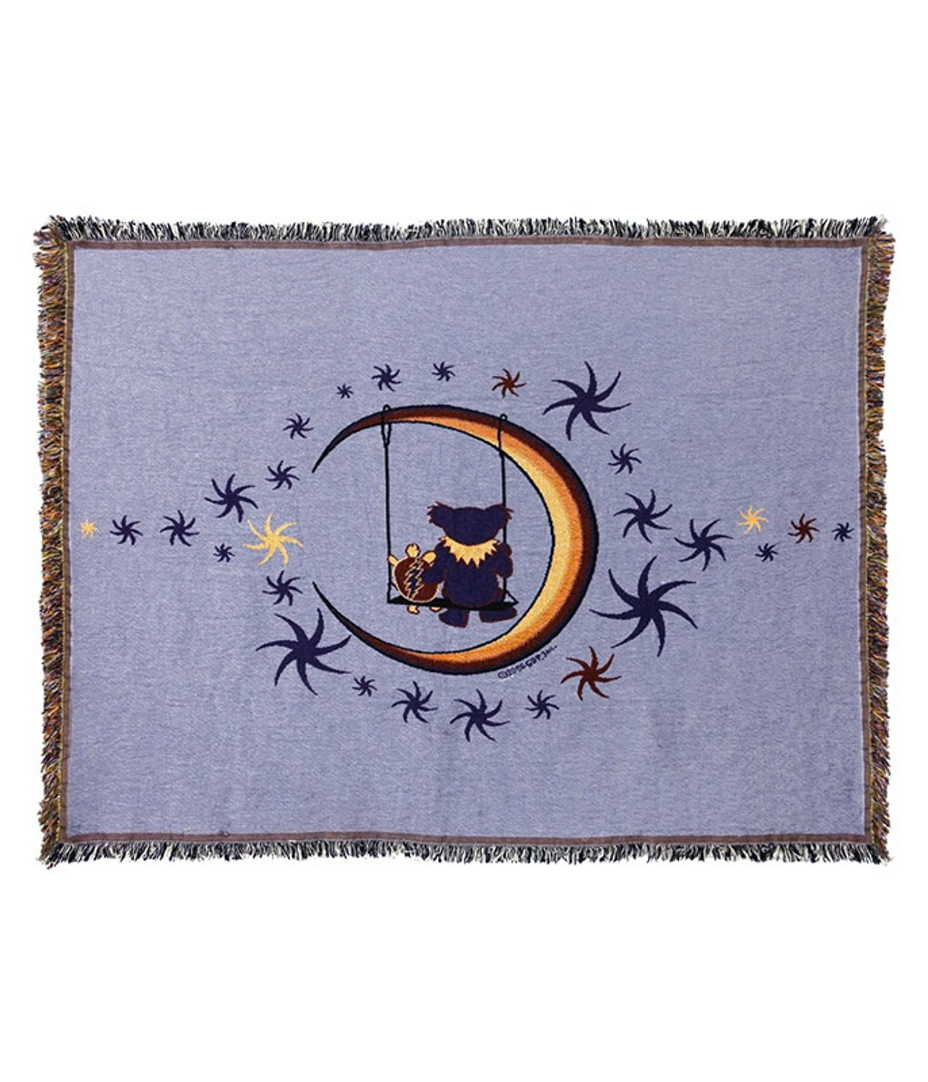 The Moon Swing Woven Blanket featuring the art of Taylor Swope. Measures 53 in. x 69 in. 100% cotton. Grown and woven in USA. Perfect for picnics, naps under trees, festivals or a throw for your home. Care Instructions : Machine Wash Cold, Front Load Commercial washer, Mild Detergent or hand wash Mild detergent. Tumble low or Dry clean. Officially Licensed Rock and Roll Merchandise | Gifts & Accessories